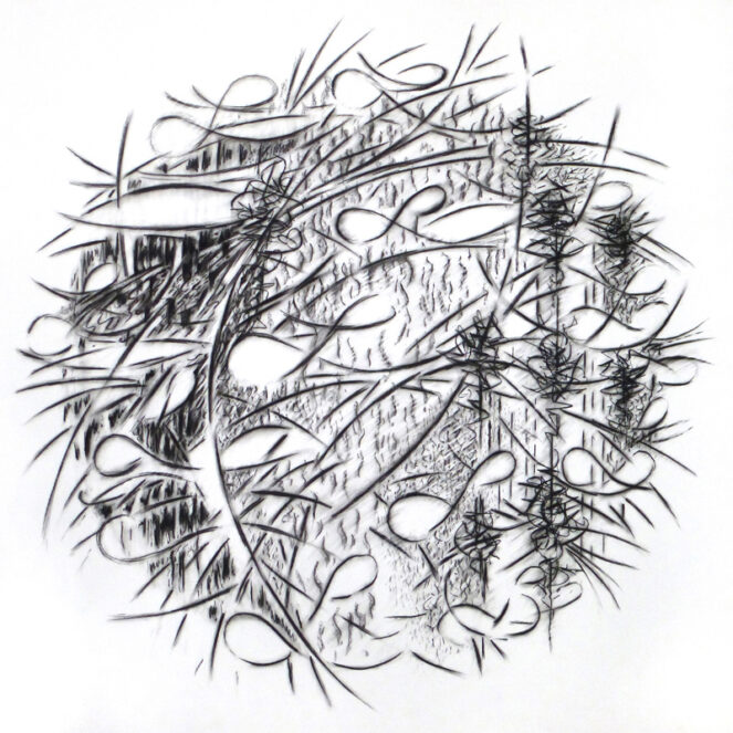 Dessin : Forme simple et dedans gribouillages et infinies combinaisons de formes récurrentes, loin d’une étroite imitation, forment non pas une illusion mais une connivence avec la nature et l’esprit.